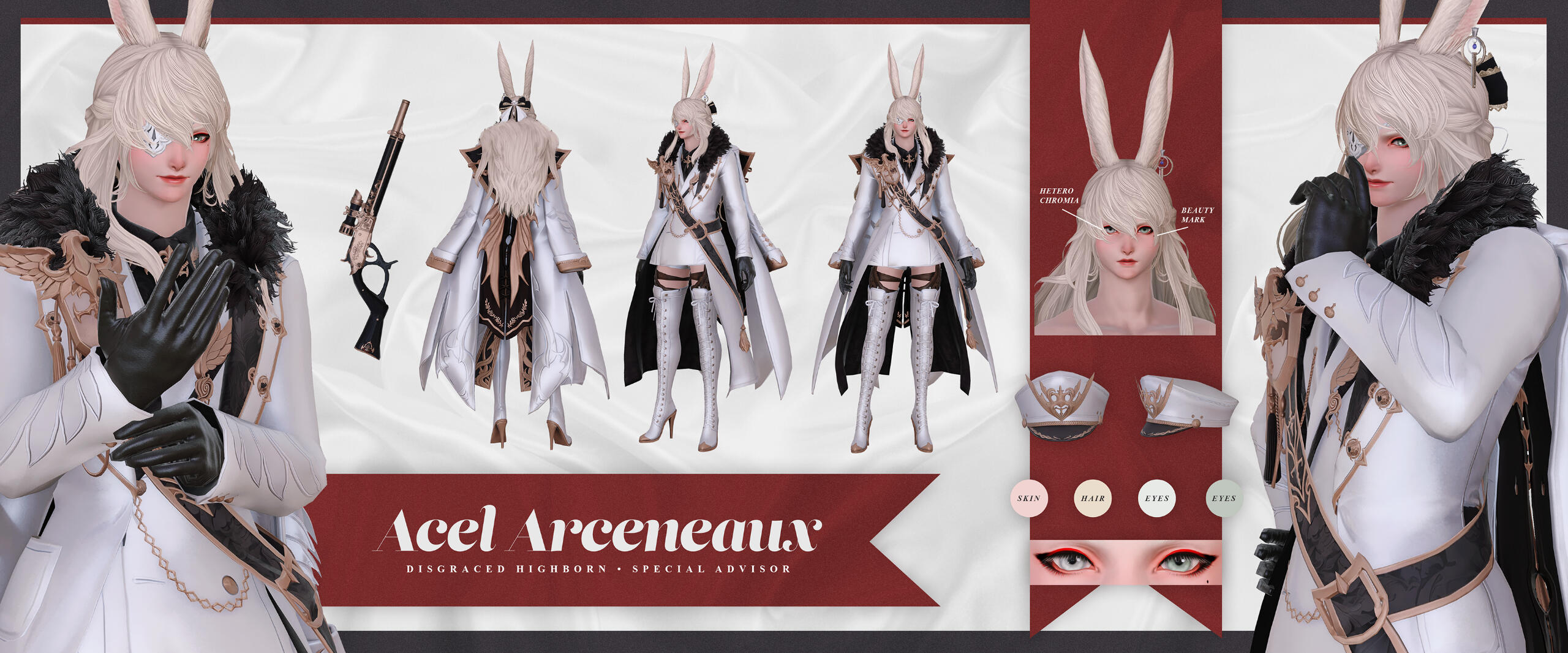 AS THE SINGLE HEIR   to House Arceneaux, Acel was under no misguidance about his lot in life. Though they were a minor house, they partook in all the usual fares of Ishgardian highborns, and from young Acel has watched his father navigate highborn politics with unfathomable finesse, to the envy and chagrin of their peers.Still, being adept at Ishgardian politics held little honour despite reputation being king. Alliances were made and broken at the drop of a hat, opponents were sold out or set up for accusation mercilessly—yet, this was home, and it was all the Veena knew, for he had never even heard of the vast forests that could have possibly been his home, long before his mother traversed down from the mountains.Though House Arceneaux was regarded with the same apathy and distrust as the many others around them, Acel was nonetheless eager for his future role. It seemed to be natural, this way of life—to rise or fall from one's own wit, or to win honour not by who espoused the highest personal virtues, but through valour on the battlefield. Talented as the young Arceneaux heir was, Acel knew not fear, nor any future in which he could even conceivably be anything but one of the elite.At least, that was until the end of the Dragonsong War, when the revelation of treachery ripped through Ishgard like wildfire, thawing a thousand year old hatred and yet sparking new animosity from the ashes. No longer were they fighting dragons, but instead a faction of the lowborn wanted their revenge, and House Arceneaux stood among the noble houses which paid the price for their haughty privilege.Spared the ransack and slaughter by serendipity of a request to stay behind at the Scholasticate one night, Acel will never know if the other students knew of the plan, nor if they truly wanted to spare him or to see him suffer more. Given his reputation, the latter was just as likely—or perhaps they simply didn't think he would make it home just in time to see his parents fall.Regardless, Ishgard was fast changing, and she had no tolerance for the old.Even as the immediate anger simmered down, the students at the Scholasticate continued to be harassed, and though Acel was stubborn about holding his head high in spite of the devastating loss, he was no match for the daily attempts on his life. Even arrogance had its limits, and while Acel was just about ready to claw out his own flesh in frustration, eventually he was forced to flee Ishgard altogether.What remained of the Arceneaux estate was decimated, plundered and divvied up or otherwise smuggled to the Far East. Acel himself carried only one memento, and when he arrived in Kugane he had no choice but to give up his father's blade as well.In exchange for protection, the few remaining members of the Arceneaux line chose instead to serve a kumicho, working as otherwise dispensable lackeys that helped extend reach back into their homeland. While they seemed happy enough to sell out their own country, Acel would quickly grow tired of such a life—devoid of both pride and honour, scurrying about like cockroaches away from the light of authority. Regardless of what the country had—or will—become, and in spite of the animosity from his own people, Acel still considered himself a proud son of Ishgard. No amount of racism nor classism was about sway him, past or present.With his mind made up, Acel would return to Ishgard as a ward of another house, though he would continue to use his last name in defiance of all attempts to wipe it from the ledgers. From there, he intends to rebuild all that he'd lost, whether by wile or by force.